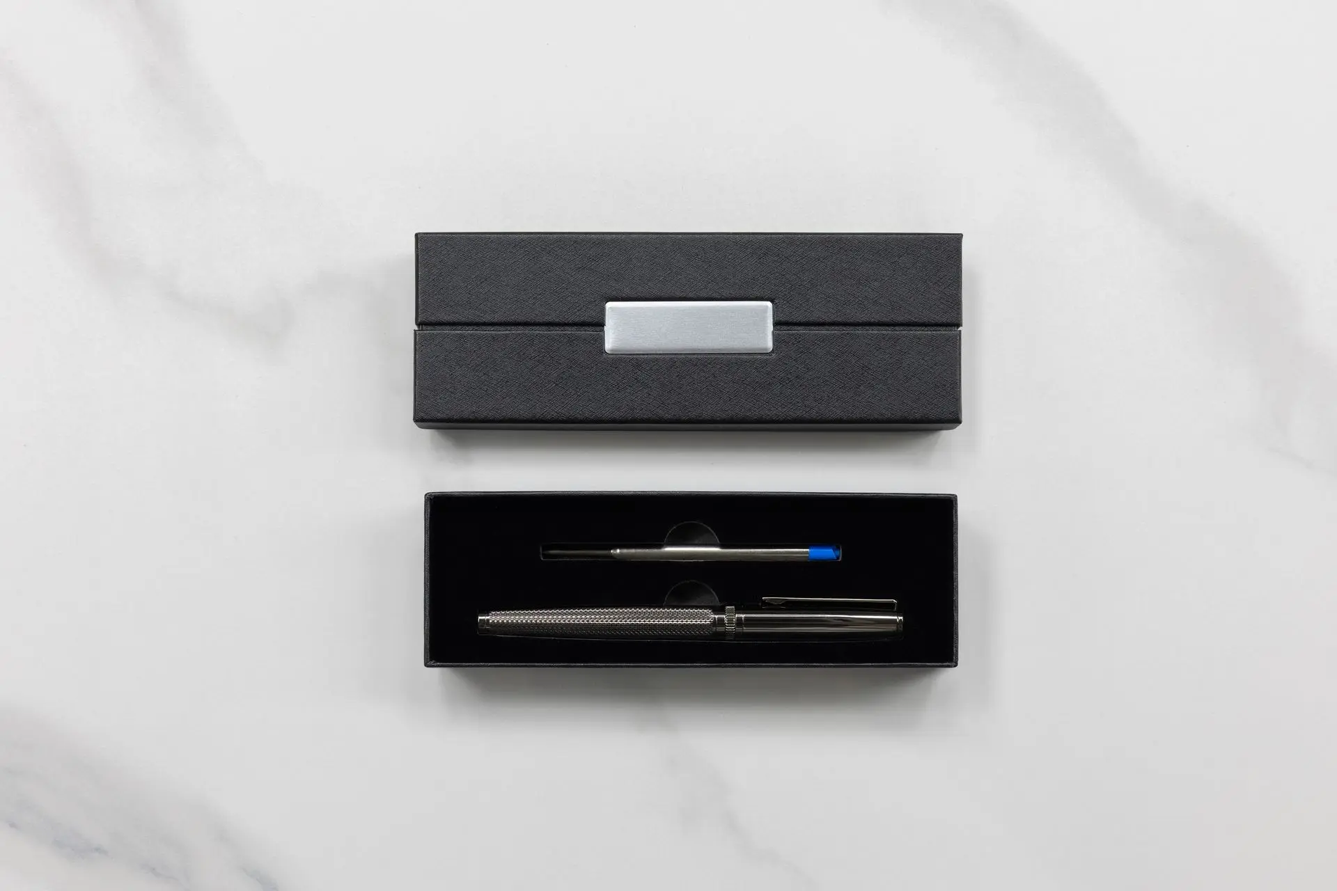 Presented in a luxury box that mirrors the Furtif pen’s refined aesthetic, each case features a discreet metal branding plate— elegantly integrated and ready for custom engraving to elevate your corporate identity.