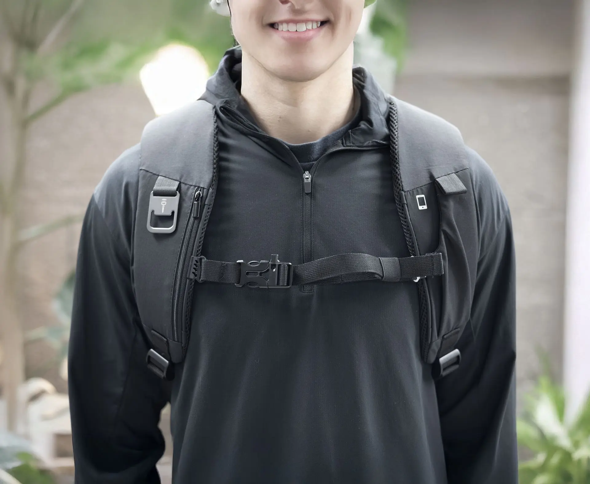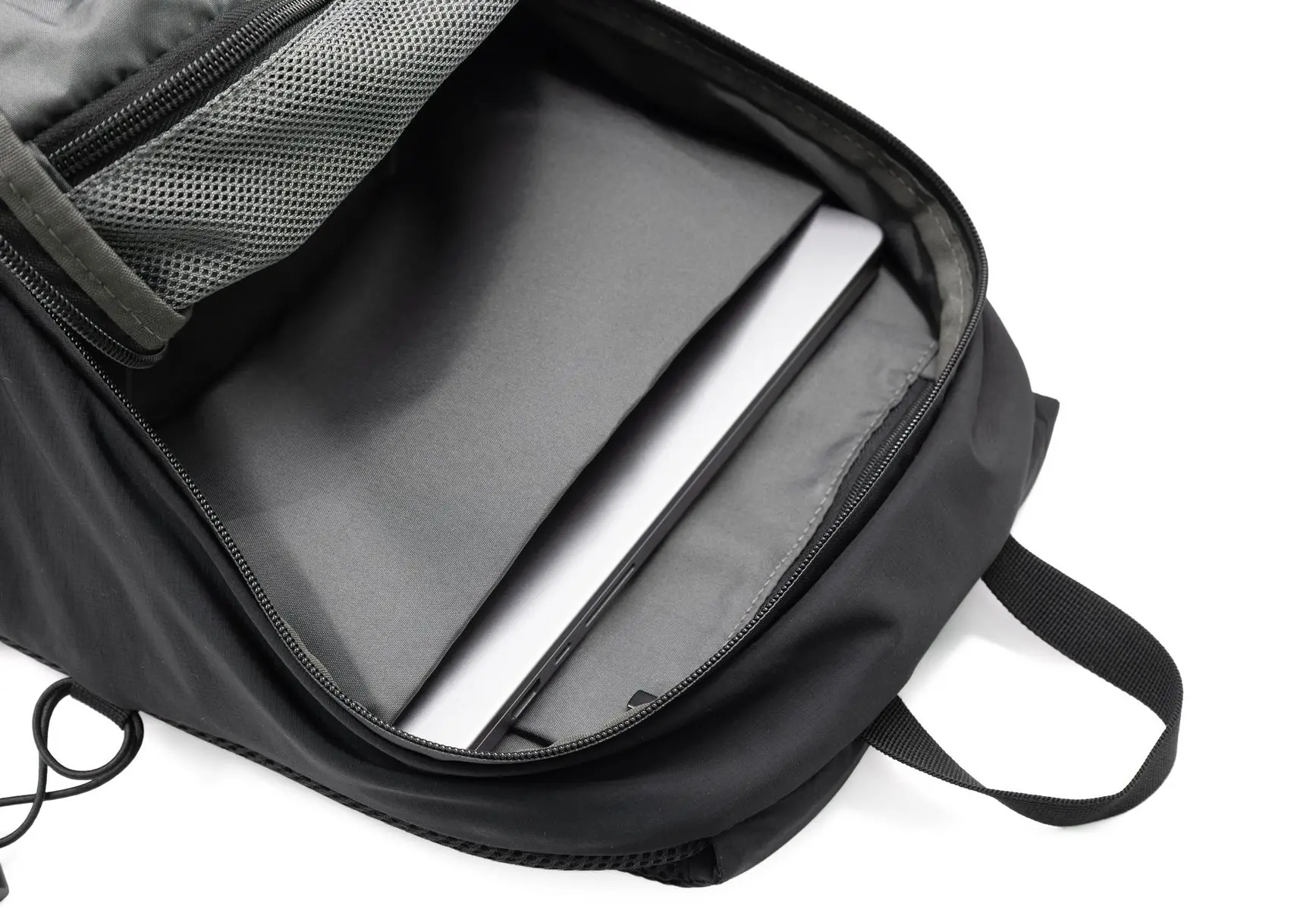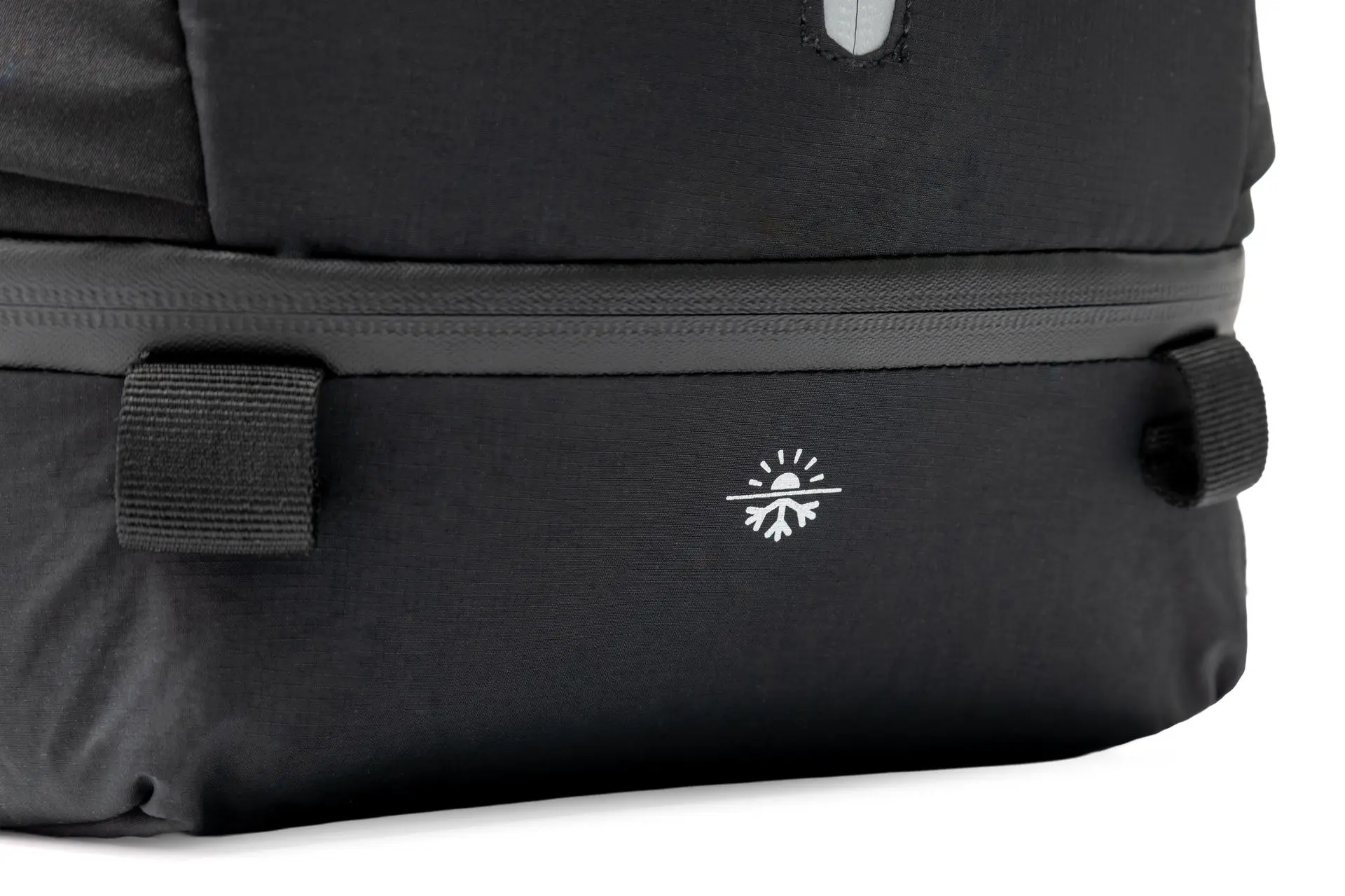 Features include a drawbridge-style opening for quick access, an insulated compartment to keep food cool or warm, multiple intuitive pockets, and a dedicated internal sleeve that fits up to a 16” laptop. A rigid hardboard back panel ensures structure and protection, while the breathable, shock-absorbing padding delivers comfortable carry mile after mile.