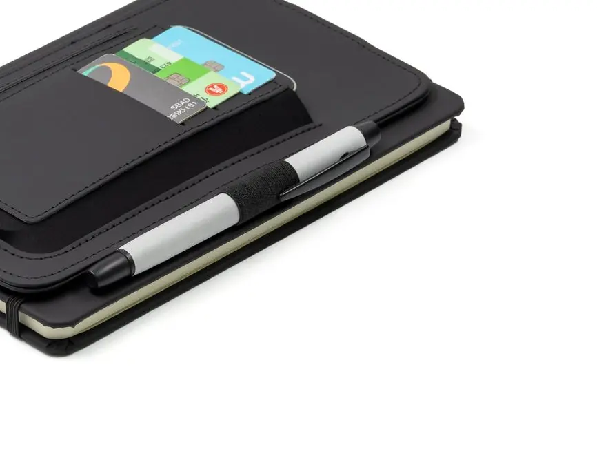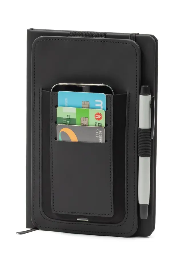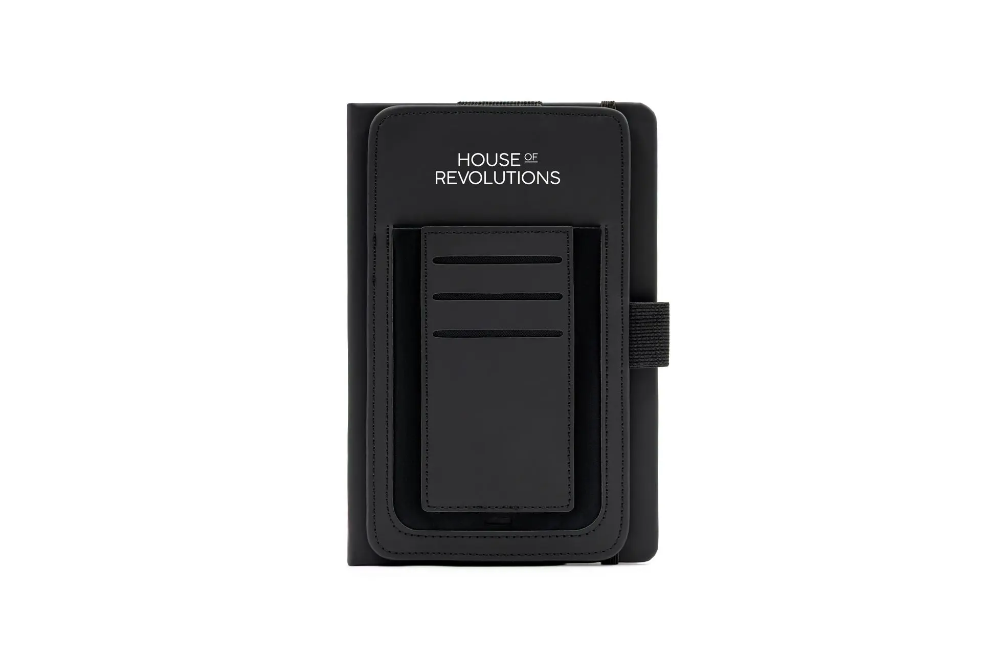 Blending style and function, this A5 hardcover notebook features a removable utility belt made from recycled materials—complete with cardholder, pen loop, and phone pocket.