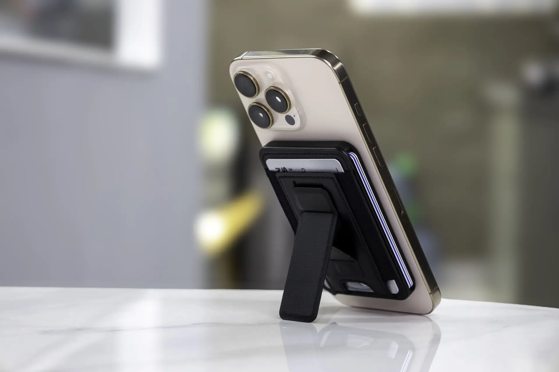 But we didn’t stop there. Snap it magnetically to your MagSafe-enabled phone, then unfold it into a rock-solid builtin stand. Stream, scroll, or video call — rotate effortlessly between portrait and landscape mode without missing a beat. Whether you’re binge-watching on the train, presenting in a meeting, or FaceTiming from the couch, Wally Stand Pro has your back (and your cards).